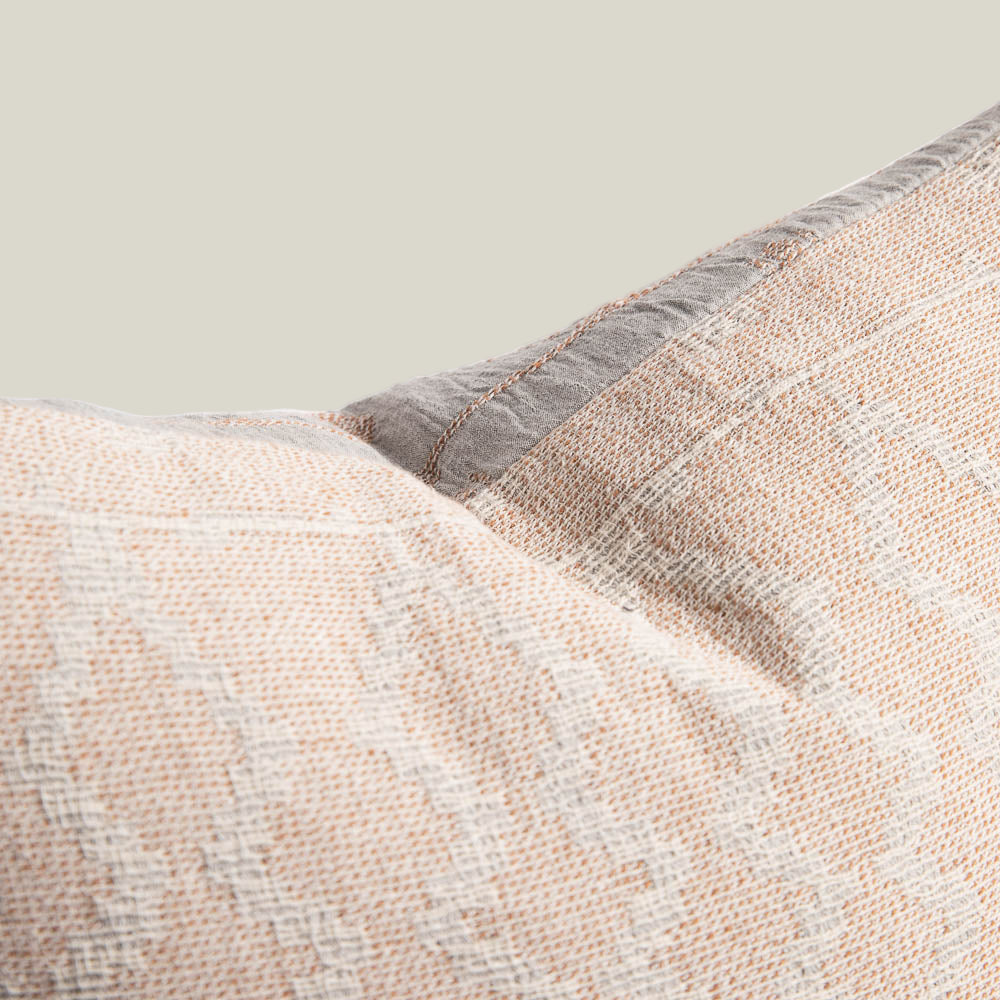 Discover serenity with the Sora Reversible Pillow, a harmonious blend of Japanese-inspired design and artisanal craftsmanship. Its geometric pattern rendered in soft clay and muted blue tones, evokes a sense of calm, making it a perfect addition to your space. 100% cotton with a luxurious jacquard weave Reversible for versatile styling options Delicate fringing on the short sides Subtle geometric pattern for a timeless aesthetic Soft clay and muted blue tones to complement any decor Available in a long lumbar (120x40cm) and bed cover OEKO-TEX and GOTS certified