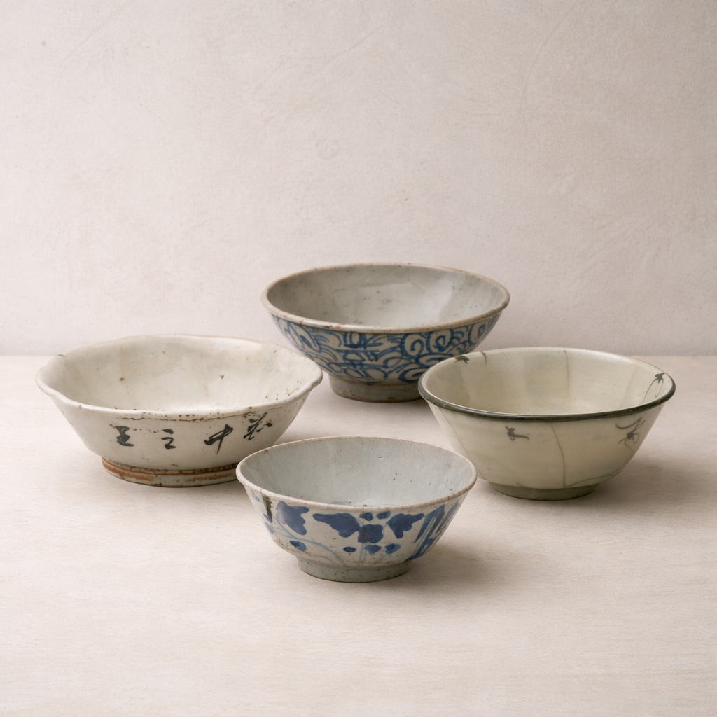 Once part of everyday family meals, these Vintage Rice Bowls carry with them the quiet beauty of a well-loved table. Each porcelain bowl features its own decorative character—from delicate brushwork to classic blue-and-white motifs—offering a glimpse into the artistry of traditional tableware.