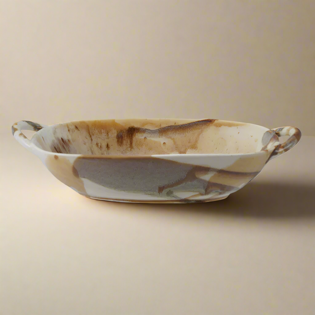 Artful and functional, the Watercolor Serving Dish with Handles brings painterly beauty to the table. Crafted from durable stoneware, this versatile baker and server is finished in a multicolor reactive glaze that creates soft, fluid layers of earthy tones. With each firing, the glaze reveals subtle variations, ensuring that no two pieces are exactly alike.
